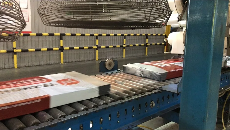 Финальный этап — упаковка готовой продукции. Сформированные пачки проходят через термоусадочную печь с температурой около 220 °С. Если пачек продукции на конвейере скапливается слишком много, то процесс замедляется. За финальным качеством упаковок наблюдает оператор, который отслеживает насколько ровно произошла усадка пленки, регулирует параметры термоусадочной печи.