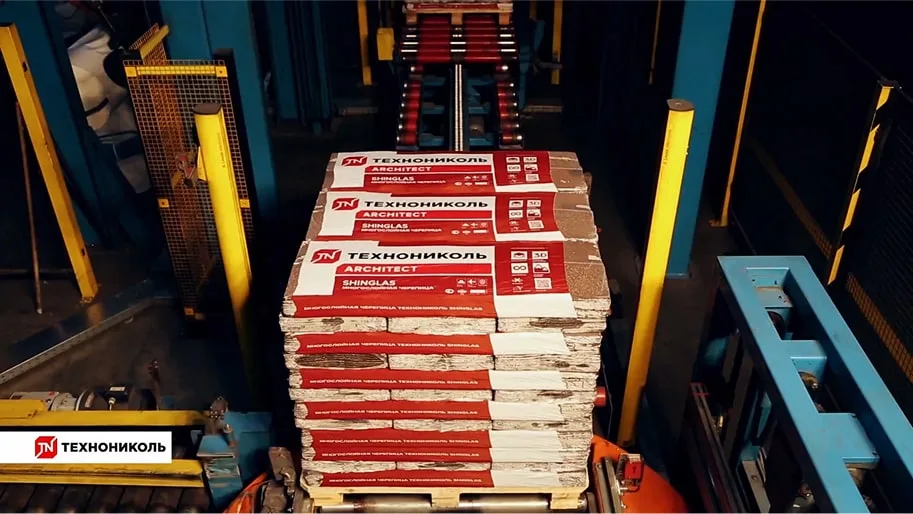 За короткий промежуток времени линия успевает произвести несколько сотен, почти тысячу квадратных метров материала. И каждый метр прошел через десятки автоматических проверок — от температуры битума и правильности дозировки всех компонентов до качества нанесения гранул, соблюдения цветовой рецептуры, геометрии гонтов и контроля веса поддона с готовой продукцией.