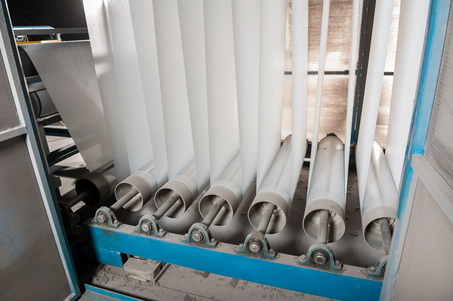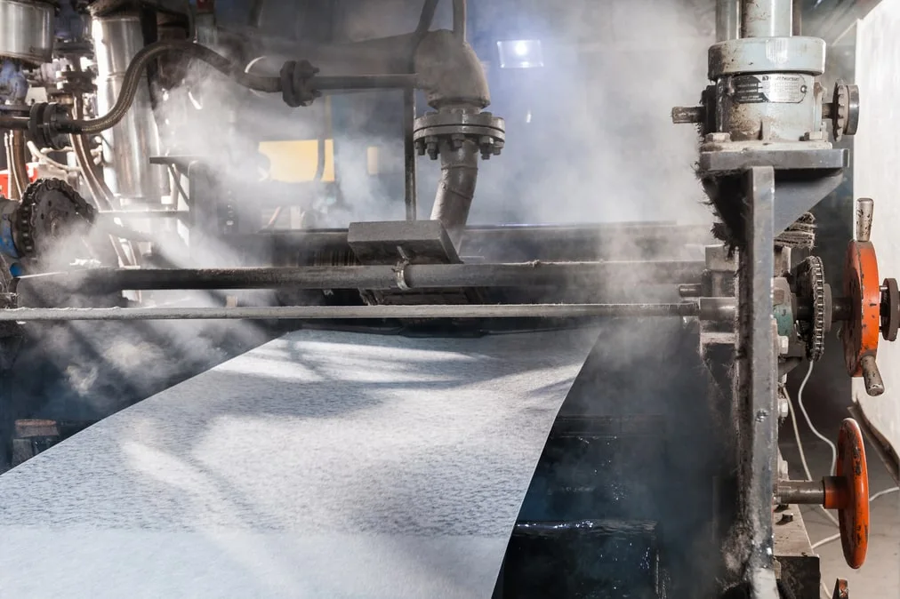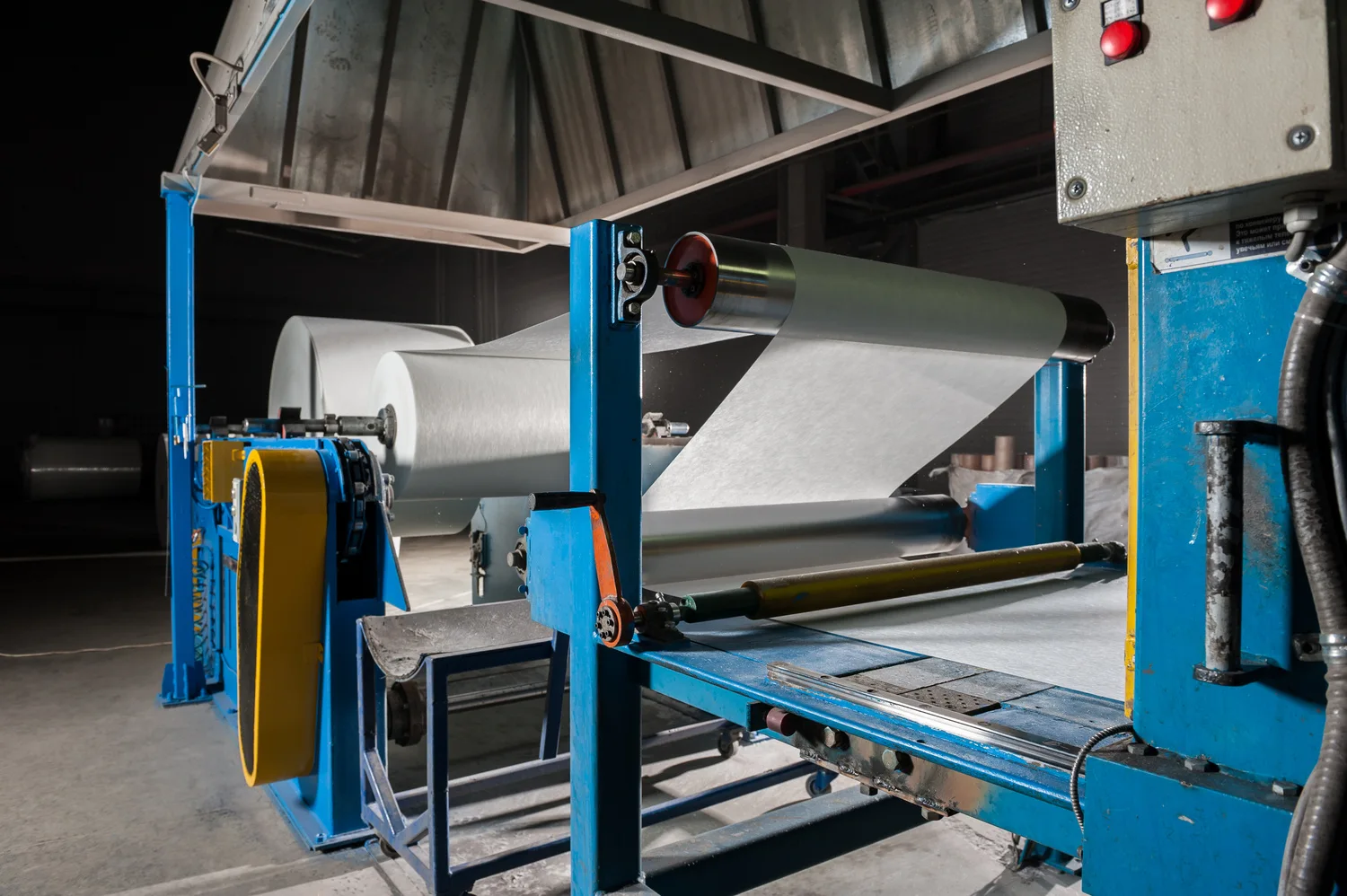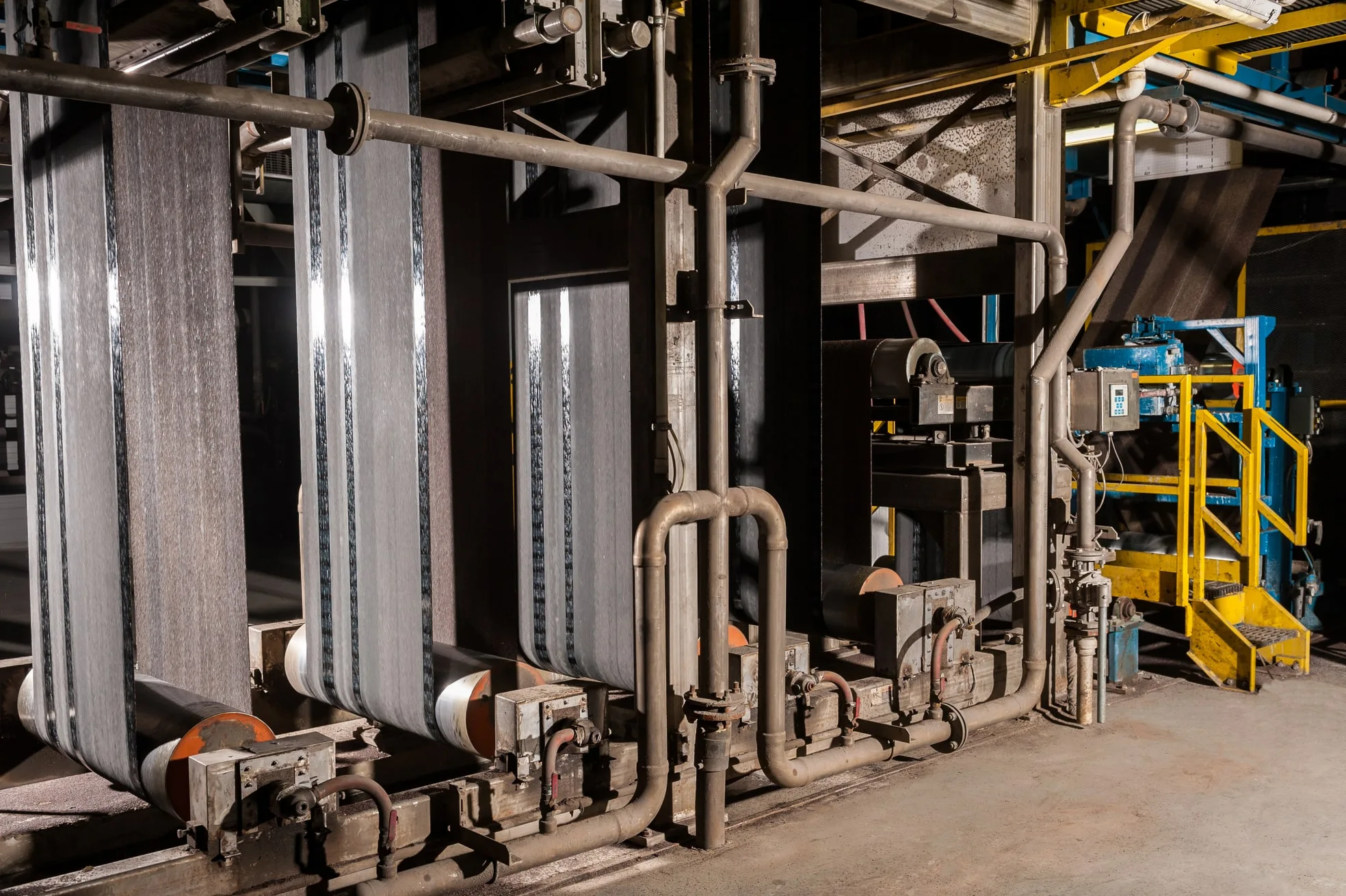 Производство гибкой черепицы SHINGLAS представляет собой сложный технологический комплекс, где каждый этап тщательно выверен и автоматизирован. Процесс создания черепицы начинается у узла размотки основы, где происходит подача стеклохолста. Материал особый: плотный, прочный, и что важно — исключительно стойкий к биопоражениям