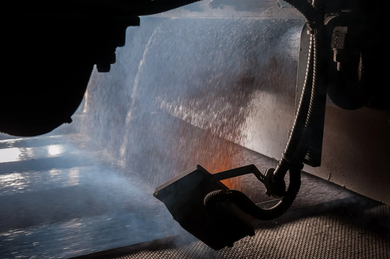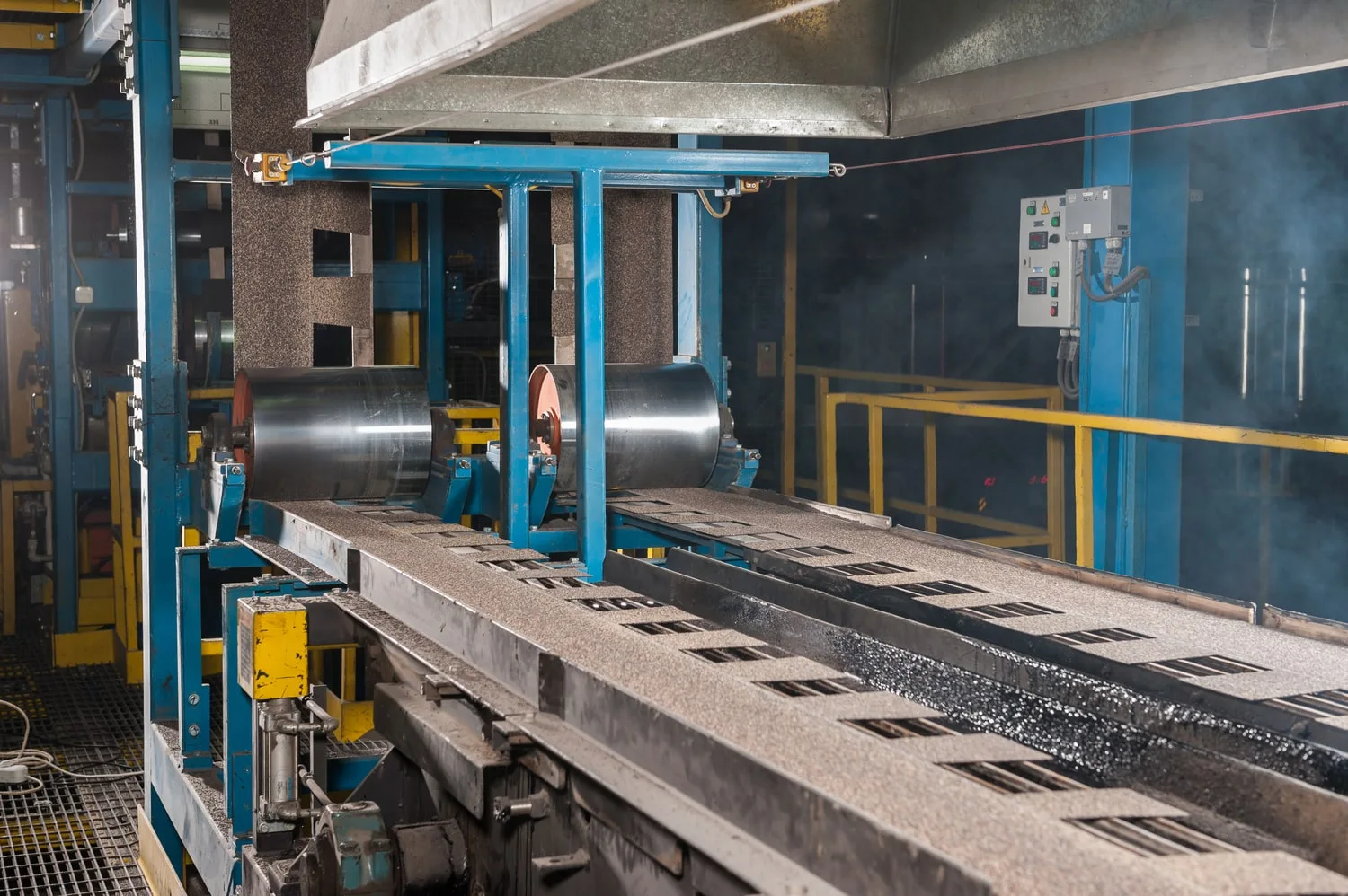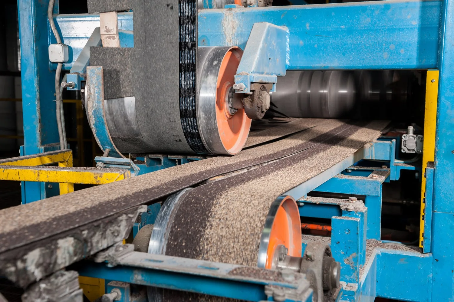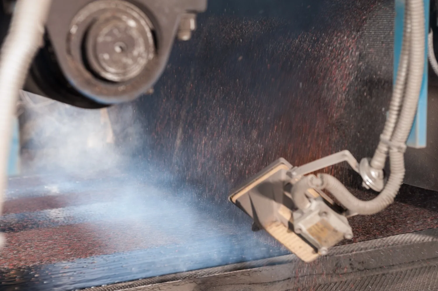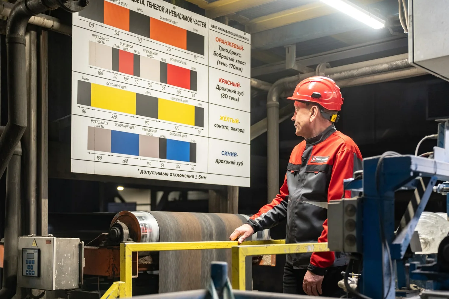 На следующем этапе производства происходит настоящая магия цвета. Гранулы разных оттенков автоматически смешиваются согласно заданной в компьютере рецептуре и равномерно наносятся на пышащее жаром полотно. Удивительно, как точно система дозирует каждый цвет, создавая неповторимый рисунок будущей кровли.