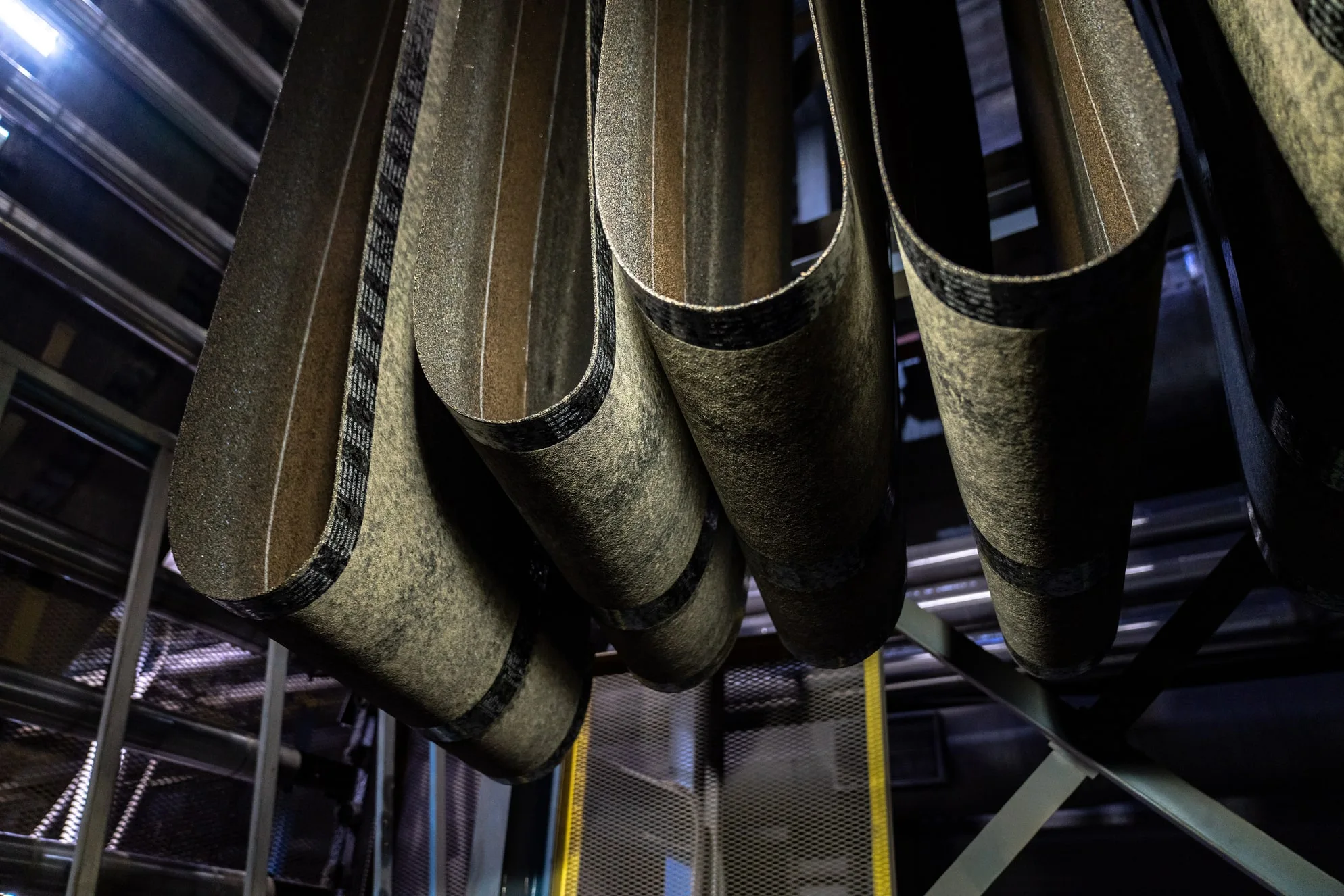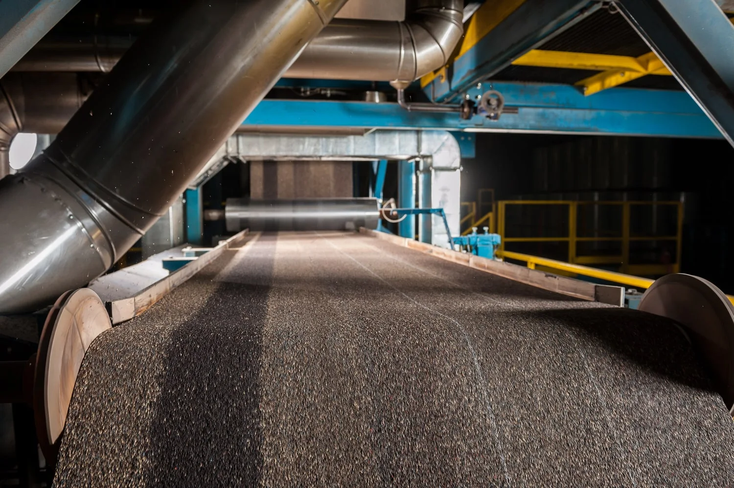 Рядом возвышается еще одно впечатляющее сооружение — двенадцать массивных резервуаров (силосов) для хранения базальтовых гранул. Каждый резервуар вмещает по 200 тонн посыпки. В производстве используется более 50 различных цветов и оттенков гранул. Посыпка поступает из Карелии и с Урала, где добывают горную породу, которая отвечает высоким требованиям по составу и твердости. Помимо основных резервуаров имеются мобильные бункеры меньшего объема. В них хранятся гранулы редких оттенков. Это позволяет быть гибкими, даже если заказчику нужна небольшая партия эксклюзивного цвета.