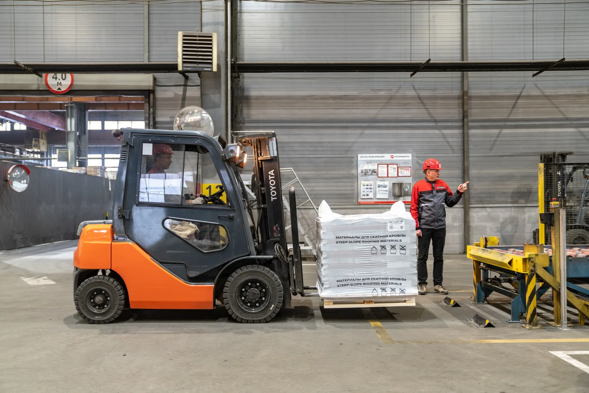 Транспортировка паллеты на склад готовой продукции погрузчиком