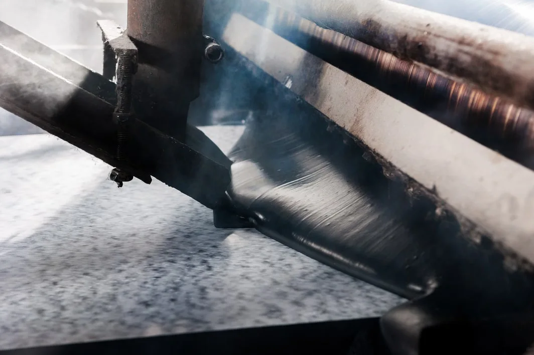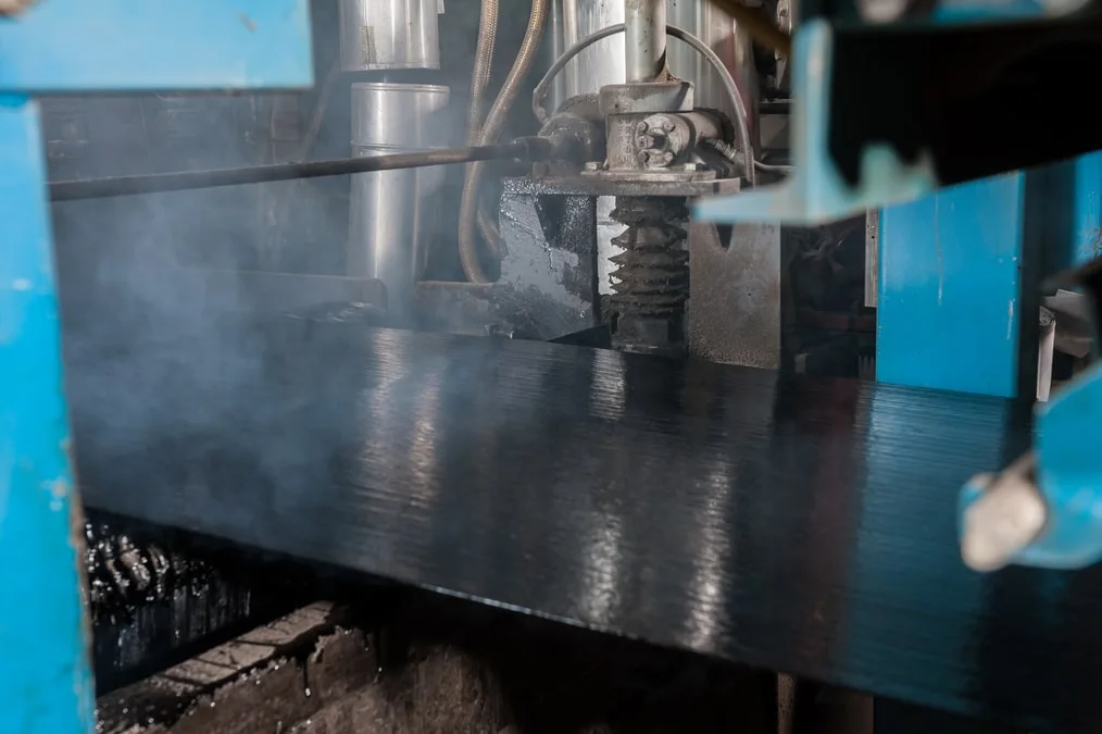 Следующий этап — прохождение основы через покровно-пропиточную ванну. Для увеличения срока эксплуатации черепицы и подготовки полотна к нанесению основного гидроизоляционного слоя — битумного состава (вяжущего), стеклохолст проходит этап предпропитки и насыщения битумным компаундом при температуре свыше 200°С.