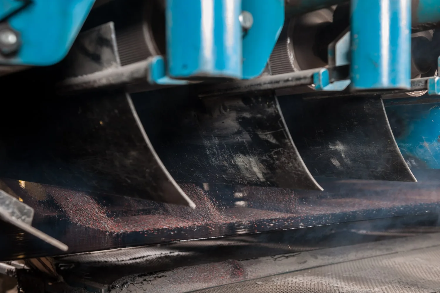 На участке резки материал обретает свою окончательную форму. Замена ножей, если нужно перейти на другой вид нарезки, занимает всего 30-35 секунд: два оператора выкатывают кассету с ножами по специальным рельсам и устанавливают новую, — отработанные движения напоминают pit-stop в Формуле-1.
