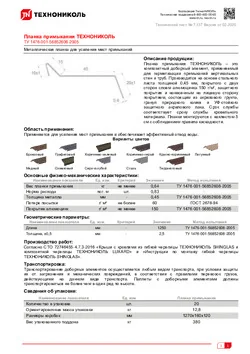 Планка примыкания ТЕХНОНИКОЛЬ – это композитный доборный элемент, применяемый для герметизации примыканий вертикальных стен и труб. Производится на основе стального листа толщиной 0,45 мм, покрытого с двух сторон слоем алюмоцинка 150 г/м², защитного покрытия и нанесенным на лицевую сторону покрытием, состоящим из акрилового грунта, гранул природного камня и УФ-стойкого защитного акрилового лака. Срок службы соответствует сроку службы кровельного материала. Планки монтируются с нахлестом 5 см с соблюдением правила каскадности.