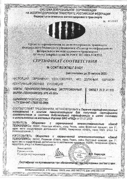 Продукт сертифицирован в системе Федерального агентства железнодорожного транспорта. Соответствует требованиям к сертификационным показателям, установленным «Техническими указаниями на применение пенополистирола и геотекстиля при усилении основной площадки земляного полотна без снятия рельсошпальной решетки» и «Руководству по применению полимерных материалов для усиления земляного полотна при ремонтах пути».