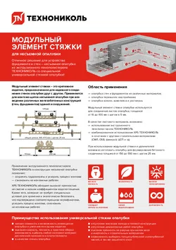 Модульный элемент стяжки применяется в конструкции быстровозводимых монолитных зданий и сооружений, в т. ч. стен, фундаментов, перемычек над проемами, колонн, армопоясов и ростверков по технологии несъемной опалубки. В качестве листового материала опалубки, применяется экструзионный пенополистирол ТЕХНОНИКОЛЬ. Возможно комбинированное использование ХРS ТЕХНОНИКОЛЬ в сочетании с другими строительными материалами: СМЛ, плитой ОСВ, фанерой, ЦСП. При использовании Универсальной стяжки, возможно, изготовить опалубку для формирования бетонного сердечника толщиной от 150 до 250 мм с шагом 25 мм.