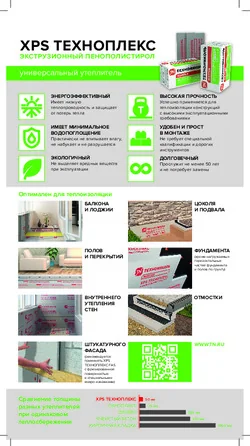 Мелкая закрытопористая структура экструзионного пенополистирола обеспечивает XPS ТЕХНОНИКОЛЬ ТЕХНОПЛЕКС FAS низкий коэффициент теплопроводности и высокий уровень теплосбережения — 0,032–0,037 Вт/(м*К) при 25±5 ºC в зависимости от толщины материала. Их использование в составе строительных конструкций гарантирует комфортную температуру весь год — тепло зимой и прохладу летом. Теплоизоляционные свойства материала сохраняются на протяжении всего срока службы.