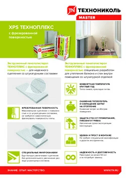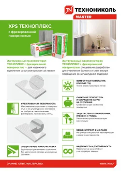 Здравствуйте. Фрезерованная поверхность обеспечивает максимальное сцепление поверхности плит XPS ТЕХНОНИКОЛЬ ТЕХНОПЛЕКС FAS со штукатурными составами, при этом не требуется самостоятельно фрезеровать поверхность плиты. Специальные микроканавки еще больше увеличивают сцепление без увеличения расхода штукатурных составов.