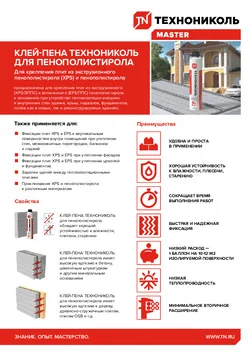 Клей-пена ТЕХНОНИКОЛЬ PROFESSIONAL для пенополистирола предназначена для крепления плит из пенополистирола и экструзионного пенополистирола к основанию при устройстве теплоизоляции внешних и внутренних стен здания, крыш, подвалов, фундаментов, полов как в новых, так и реконструируемых зданиях.