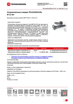 Остроконечный саморез Ø4,8 мм выпускается длиной от 50 до 160 мм. Скорость засверливания при монтаже с использованием саморезов ТЕХНОНИКОЛЬ увеличивается на 5 секунд на каждом изделии. Стойкость к нагреву позволяет использовать изделия многократно, так как они не теряют способность засверливания.