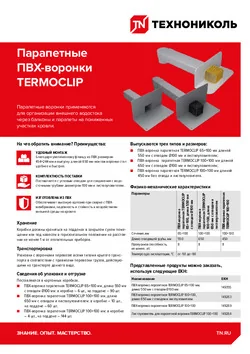 ПВХ-воронка парапетная TERMOCLIP® 100х100 мм с отводом и листоуловителем используется при строительстве и реконструкции зданий и сооружений. Применяется на плоских кровлях с гидроизоляцией из ПВХ-мембран с внешним водостоком через балконы и парапеты.