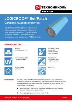 Заплатка LOGICROOF® SelfPatch предназначена для срочного временного ремонта механических повреждений (проколы, порезы, трещины и др.) на поверхности кровель из ПВХ мембран. Особенно полезна и удобна на кровлях с большой площадью, где затруднена подводка питающего кабеля для приварки заплатки горячим воздухом.