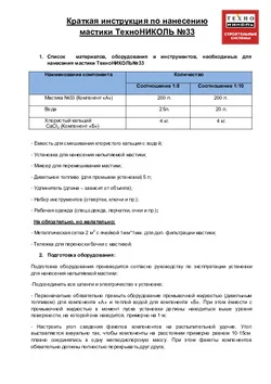 У мастики хорошая эластичность, она защищена от воздействия ультрафиолета. Хорошо подходит для бетона и металла, создает бесшовное покрытие. Полностью высыхает за 24-72 часа. Теплостойкая – до +140 °С. Перед использованием мастику ТЕХНОНИКОЛЬ №33 смешивают с раствором компонента В, который входит в комплект. Чтобы приготовить раствор, нужно смешать с водой компонент В в пропорции 1:10 — 1 кг компонента В на 10 л воды. После приготовления распыляют при помощи двухканальной дозирующей установки — RX-27/28 или аналогичной. Не содержит растворителей, позволяет работать без специализированных СИЗ.