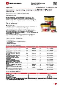 Мастика кровельная ТЕХНОНИКОЛЬ № 21 (Техномаст) представляет собой готовый к применению материал, состоящий из нефтяного битума, модифицированного искусственным каучуком, технологических добавок, минеральных наполнителей и органического растворителя. Покрытия на её основе обладают высокими: эластичностью, прочностью сцепления с основанием, теплостойкостью, устойчивостью к воздействию влаги.
