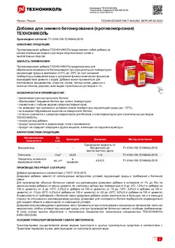 Противоморозная добавка ТЕХНОНИКОЛЬ представляет собой добавку на основе композиции водного раствора неорганических солей и многоатомных спиртов.