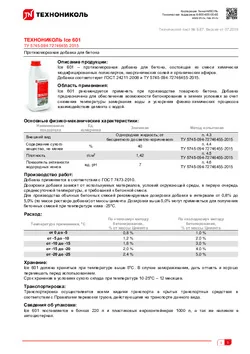 Противоморозная добавка ТЕХНОНИКОЛЬ Ice 601 представляет собой продукт на основе композиции из неорганических солей. Она отвечает стандартам ГОСТа 24211-2008 и техническим условиям 5745-094-727446455-2015.