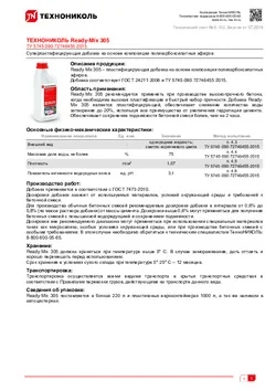 Суперпластифицирующая добавка ТЕХНОНИКОЛЬ Ready-Mix 305 представляет собой пластифицирующую добавку на основе композиции поликарбоксилатных эфиров. Добавка соответствует ГОСТ 24211-2008 и ТУ 5745-090-727446455-2015.