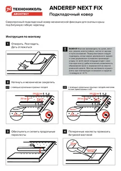 Легкий, безосновный битумно-полимерный подкладочный ковер механической фиксации. Прочное нескользящее верхнее покрытие имеет высокое сопротивление разрыву материала на стержне гвоздя.