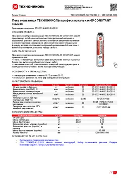 Пена монтажная профессиональная ТЕХНОНИКОЛЬ 65 CONSTANT зимняя представляет собой однокомпонентный полиуретановый материал в аэрозольной упаковке. Монтажная пена отличается умеренным первичным и низким вторичным расширением. Пена обладает хорошей адгезией к большинству строительных материалов, за исключением фторопласта, силикона и полиэтилена. Монтажная пена имеет специальную формулу, которая обеспечивает постоянный неизменяемый объем пены с момента выпенивания до полного набора свойств.