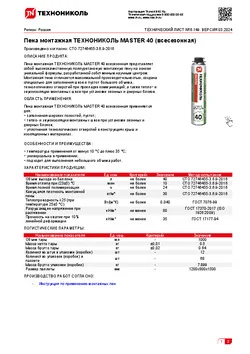 Пена монтажная ТЕХНОНИКОЛЬ MASTER 40 всесезонная представляет собой высококачественную полиуретановую монтажную пену на основе уникальной формулы, разработанной собственным научным центром. Монтажная пена отличается максимальной производительностью, создана специально для заполнения швов и пустот большого объема, технологических отверстий при прокладке коммуникаций, а также тепло- и звукоизоляции монтажных швов при установке оконных и дверных блоков.