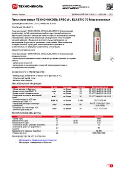 Пена монтажная ТЕХНОНИКОЛЬ SPECIAL ELASTIC 70 M всесезонная представляет собой однокомпонентный полиуретановый материал в аэрозольной упаковке. Монтажная пена отличается активным первичным расширением, умеренным вторичным расширением. Пена обладает хорошей адгезией к большинству строительных материалов, за исключением фторопласта, силикона и полиэтилена. Монтажная пена обладает плотной структурой, повышенной эластичностью.