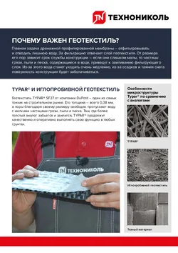 Термоскреплённый геотекстиль фильтрует воду и за счёт структуры волокон устойчив к заиливанию. Высокий модуль упругости геотекстиля обеспечивает материалу сопротивление давлению грунта без непредусмотренных деформаций.