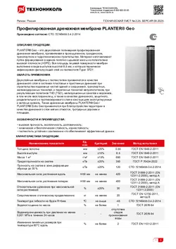 Профилированная дренажная мембрана PLANTER® Geo — двухслойное полотно из полиэтилена высокой плотности (HDPE) и термоскреплённого геотекстиля. Слои термически соединены между собой. Профиль поверхности мембраны для грунта задаётся формованными конусообразными выступами высотой 8,5 мм.