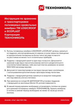 Рулоны ПМ должны храниться на поддонах, рассортированными по маркам, в сухом закрытом помещении или под навесом в горизонтальном положении не более чем в два ряда по высоте на расстоянии не менее 1 м от отопительных приборов. Допускается временное (не более 5 дней) хранение поддонов с ПМ в три ряда по высоте, при этом вес верхних поддонов должен равномерно распределяться на все рулоны нижних рядов с помощью деревянных щитов или поддонов. Допускается временное (не более 5 дней) хранение поддонов с ПМ на открытой площадке в ненарушенной заводской упаковке. Гарантийный срок хранения ПМ – 18 месяцев со дня изготовления.