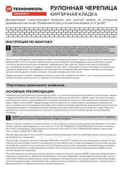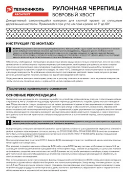 Материал монтируется на сплошное деревянное ровное, сухое, очищенное основание, при среднесуточной температуре основания и наружного воздуха выше плюс 10 °С, согласно инструкции по применению материала. При температуре от плюс 10 до плюс 15 °С материал выдержать не менее 24 часов в теплом помещении при температуре от плюс 18 до плюс 23 °С и подавать на строительную площадку объемом, необходимым для монтажа на рабочем участке. Продольный перехлест составляет 100 мм, поперечный - 200 мм. Продольный перехлест является самоклеящимся, поперечный промазывается приклеивающей битумной мастикой №23 Фиксер. Места примыкания к карнизным и торцевым планкам промазываются битумной приклеивающей мастикой №23 Фиксер. Материал дополнительно фиксируется при помощи кровельных ершеных гвоздей в местах продольных и поперечных перехлестов, в местах примыканий, ребер ендов, а также в верхней части полотна при его укладке. Материал не предназначен для наплавления.