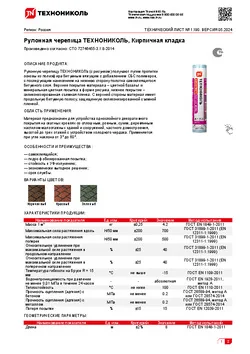 | Гибкость при пониженных температурах на брусе R="15 мм | °С | не менее | -15 | ГОСТ EN 1109-2011" |