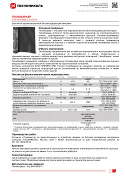 Технобарьер – это рулонный пароизоляционный битумосодержащий материал. Материал получают путем двустороннего нанесения на стекловолокнистую основу, сдублированную с металлической фольгой, ламинированной полимерной пленкой, битумно-полимерного вяжущего с последующим нанесением на обе стороны полотна защитных слоев. В качестве верхнего защитного слоя с лицевой стороны применяется мелкозернистая посыпка, а с нижней стороны легкоплавкая полимерная пленка с индикаторным рисунком. За счет наличия металлической фольгой, Технобарьер обладает высоким сопротивлением паропроницаемости.