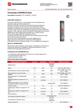 Техноэласт ENVIRO Forest состоит из смеси битумно-полимерного вяжущего (состоящего из битума, СБС (стирол-бутадиен-стирол) полимерного модификатора) с минеральным наполнителем, которое нанесено с двух сторон на полиэфирную армирующую основу. В качестве защитного слоя с верхней стороны используется крупнозернистая посыпка, обработанная специальным керамическим составом, с нижней стороны используется легко сжигаемая полимерная пленка.