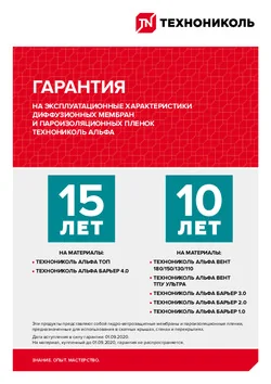 Мембрана ТЕХНОНИКОЛЬ АЛЬФА ПРОФ НГ изготавливается на основе негорючих стеклянных тканей. Мембрана устойчива к воздействию плесени и бактерий, УФ-излучению. Позволяет не только сохранить теплозащитные характеристики и срок службы утеплителя, но и защитить от случайных возгораний.