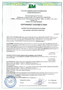 | Сопротивление паропроницанию | м²·ч·Па/мг | не менее | 100 | ГОСТ Р 59150-2020 |