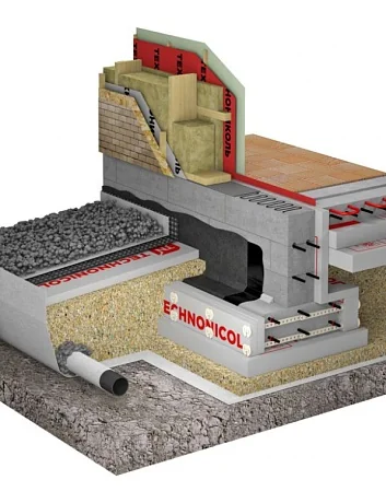 Утеплитель укладывается под будущую подошву ленточного фундамента. Для этой цели правильнее всего воспользоваться специальными марками, произведенными с учетом того, что материалу придется выдерживать высокие нагрузки. В линейке XPS ТЕХНОНИКОЛЬ такой прочностью обладают плиты CARBON ECO SP. При 10 % линейной деформации они выдерживают не менее 400 кПа, а при 2 % деформации — не менее 200 кПа. Наряду с прочностью материал обладает целым рядом важных преимуществ: не впитывает влагу, является отличным теплоизолятором. Для удобства укладки утеплитель имеет увеличенные размеры 2360*580*100 мм, что сокращает время монтажа и позволяет повысить однородность теплоизоляционного слоя за счет меньшего количества швов. При эксплуатации в экстремальных условиях, а под землей они именно такие, данные свойства очень важны.