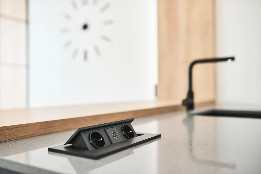 Для кухни стоит выбрать модели с крышкой: они будут защищать от брызг воды и попадания частиц пищи. Другой вариант — встроенные в столешницу выдвижные розетки.