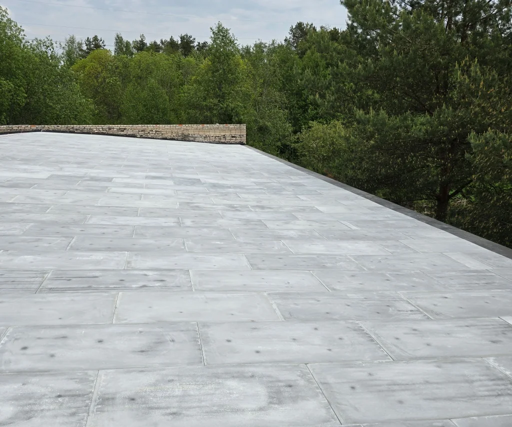 Особое внимание уделили участкам вокруг водосточных воронок — именно там мы формируем контруклоны, чтобы вода беспрепятственно стекала в систему дренажа и не задерживалась на поверхности.