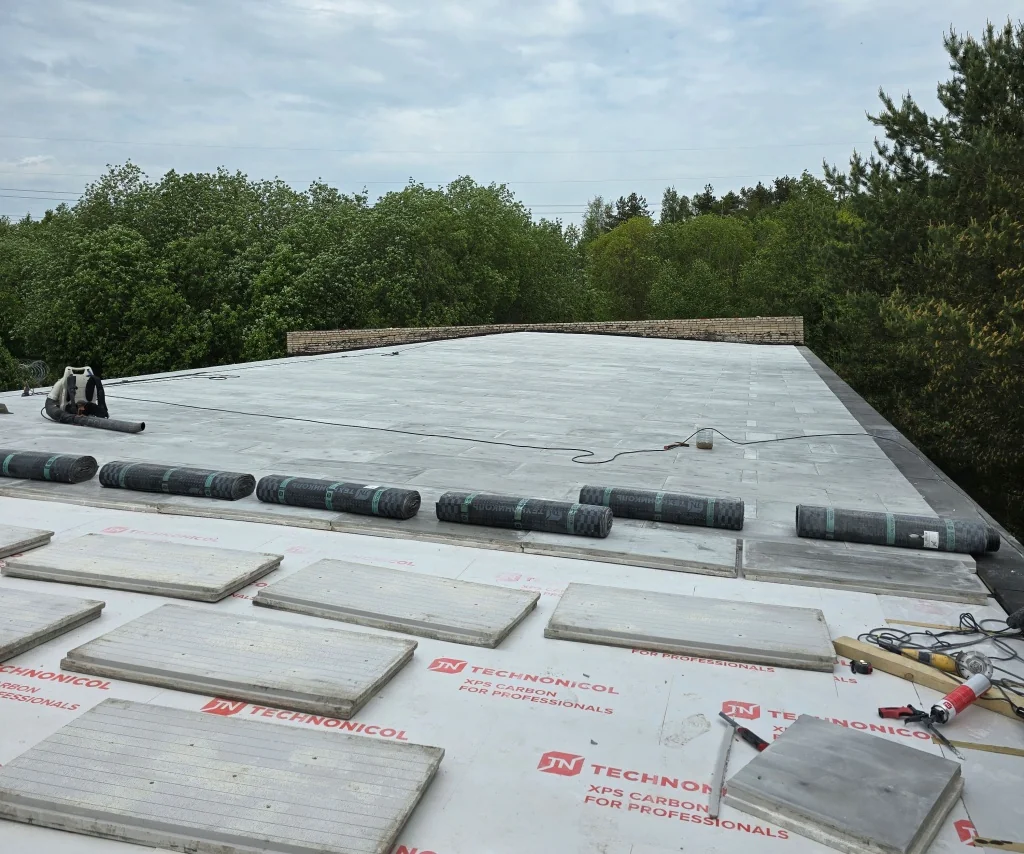 После того как уклонообразующий слой был полностью готов, уложили основной слой теплоизоляции из плит XPS CARBON PROF. Это позволило создать равномерную термозащиту всей поверхности кровли.