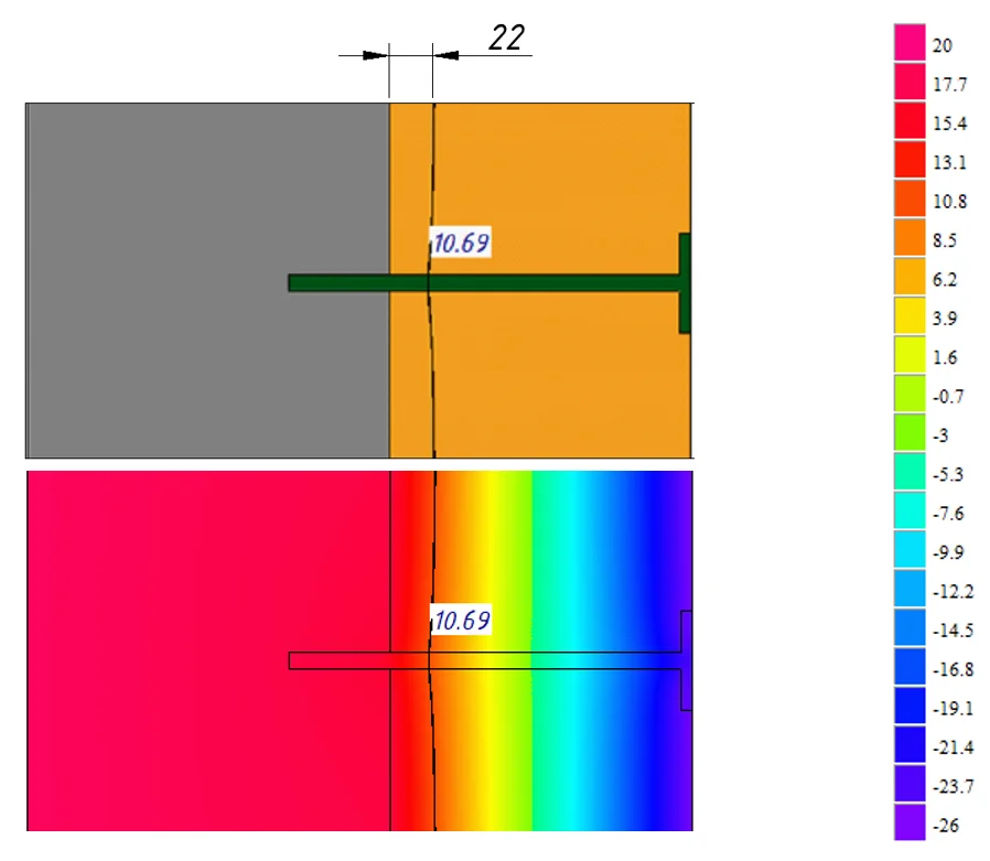 Зная теплоизоляционную способность утеплителя и теплопроводность бетона (вентфасадом в данном случае можно пренебречь) инженер может определять, в каком месте конструкции при относительно стабильной температуре за окном будет достигнута ТР. При температуре -26°C она будет находиться в толще минеральной ваты в 2.2 см от ее границы с бетоном.